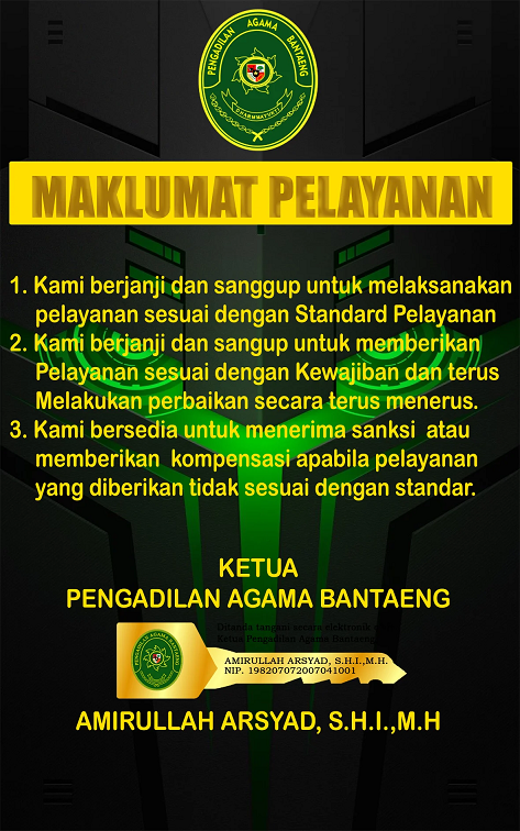 ANDA MEMASUKI WILAYAH ZONA INTEGRITAS Website ini mendukung layanan aksebilitas Selamat Hari Pahlawab 10 November 2025, Pahlawan Teladanku, Terus Bergerak, Melanjutkan Perjuangan KAMI SELURUH PEGAWAI PENGADILAN AGAMA BANTAENG MENYATAKAN SANGGUP MEMBERIKAN PELAYANAN YANG CEPAT, TEPAT DAN PROFESIONAL TANPA SUAP, PUNGLI DAN GRATIFIKASI
