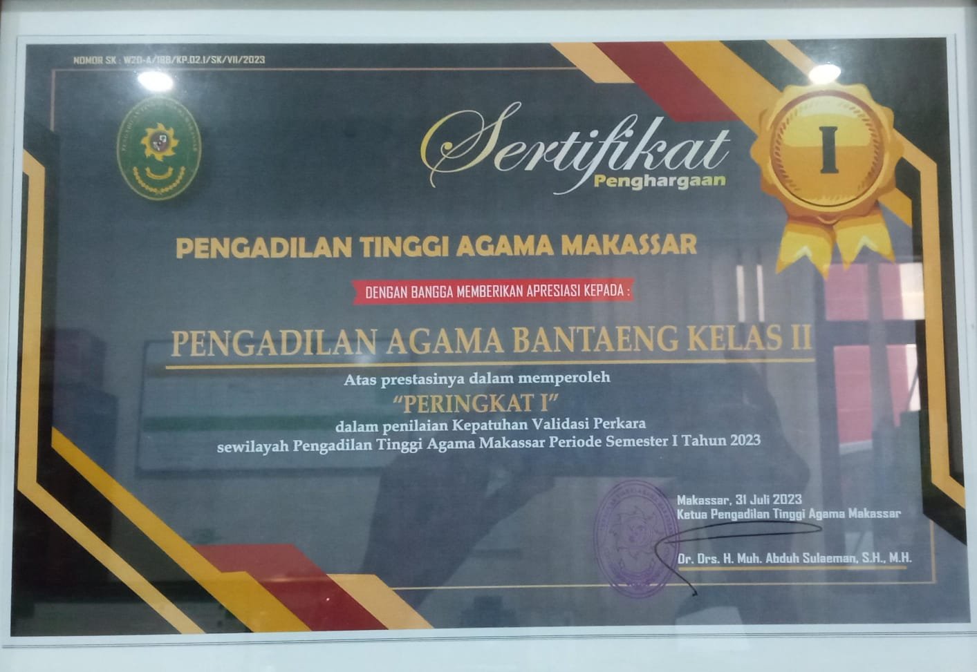 Peringkat 1 Dalam penilaian Kepatuhan Vaiidasi Periode semester I Tahun 2023 se wilayah PTA Makassar