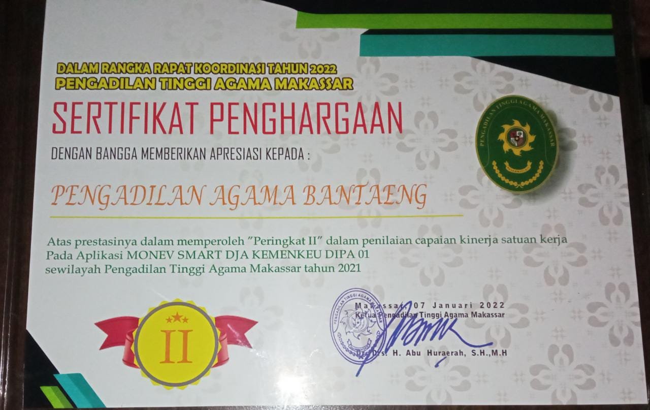 Peringkat 2 Penilaian Capaian Kinerja Satuan Kerja pada Aplikasi MONEV SMART DJA KEMENKEU DIPA 01 Sewilayah PTA Makassar Tahun 2021