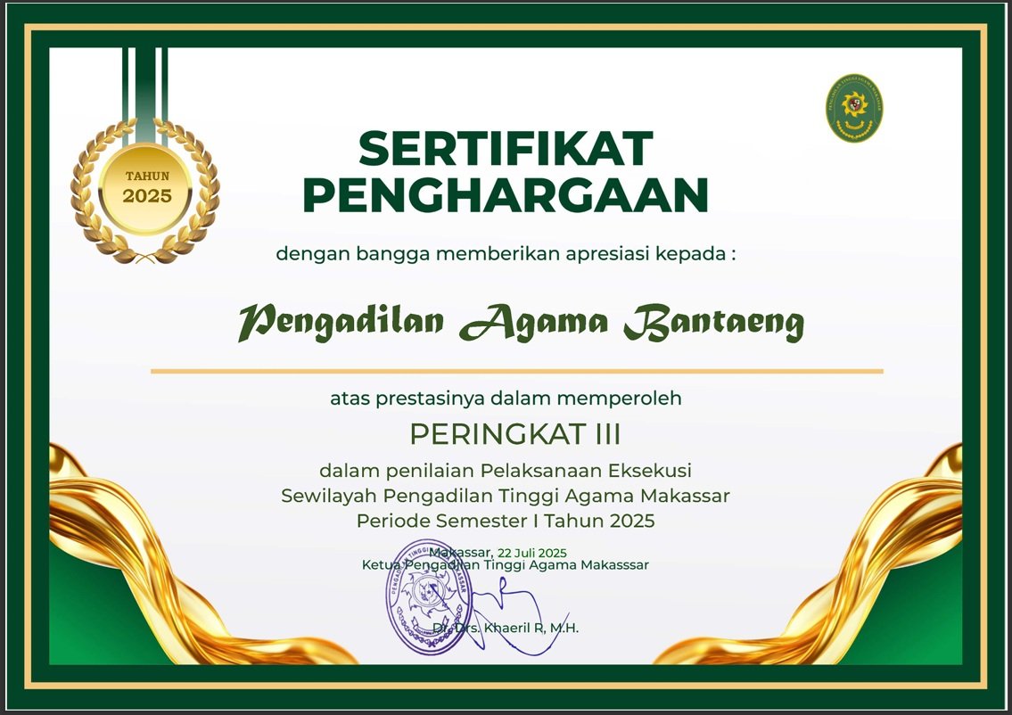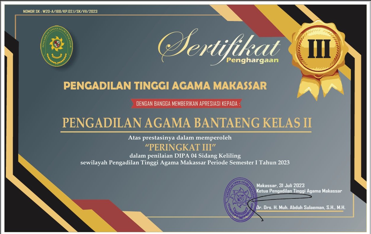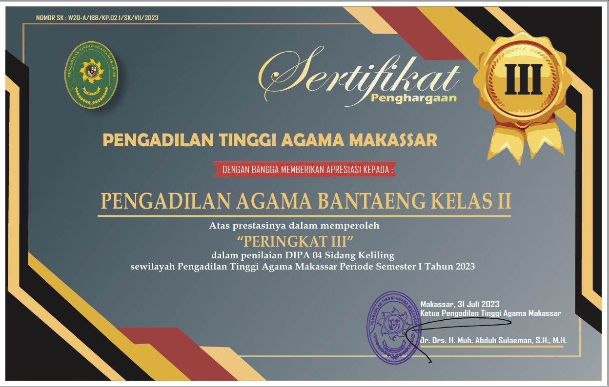 Peringkat 3 Dalam penilaian DIPA 04 Sidang Keliiling Periode semester I Tahun 2023 se wilayah PTA Makassar