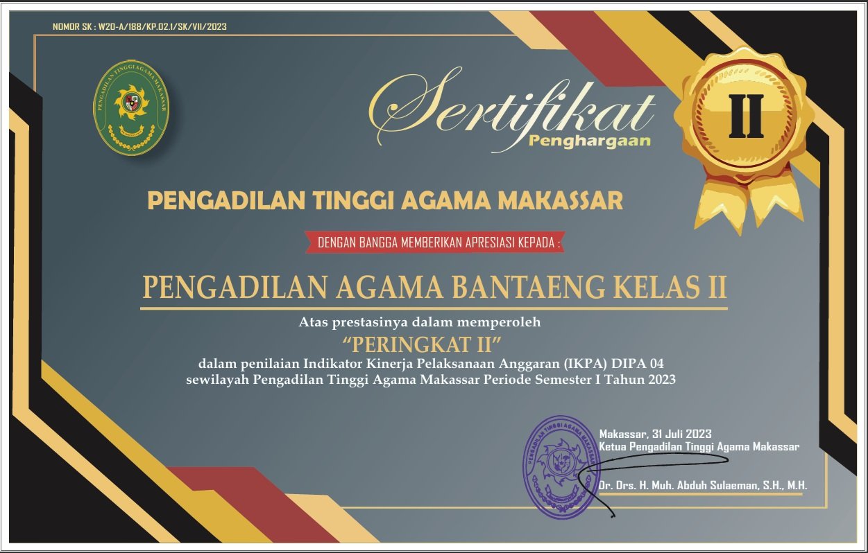 Peringkat 2 XDalam penilaian Indikator Kinerja Pelaksanaaan Anggaran (IKPA) DIPA 04 Sewilayah PTA Makassar Sester 1 Tahun 2023